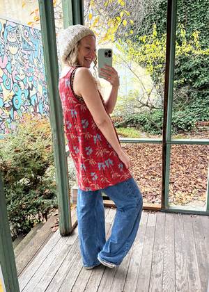 A sleeveless, reversible A-line minidress with a center back seam and subtle darting at the chest. Made in Ace & Jig's Birdcage textilea luxe, supersoft, substantial fabric with woven lily motifs in peach and cyan atop red and umber triangles. Made in India. 100% organic cotton. Hand wash cold or dry clean, dry flat. This textile is made with 100% GOTS (Global Organic Textile Standard) non-GMO organic cotton without the use of harmful chemicals and synthetic fertilizers. This garment is sewn in a Fair Trade Certified factory. Jenna is 5'6" and wears the Chapel Dress in Birdcage, size S. Measurements (taken flat; allow for natural sewing tolerance): XXS: 32 long, 17 chest, 20 waist XS: 32 long, 17 chest, 20 waist S: 33 long, 18 chest, 21 waist M: 33 long, 19 chest, 22 waist L: 34 long, 21 chest, 24 waist XL: 35 long, 22 chest, 25 waist 1X: 36 long, 23 chest, 26 waist 2X: 36 long, 25 chest, 28 waist 3X: 37 long, 27 chest, 30 waist 4X: 38 long, 29 chest, 32 waist To calculate full circumference of chest, bicep, waist, hip, or thigh, double the measurement provided.
