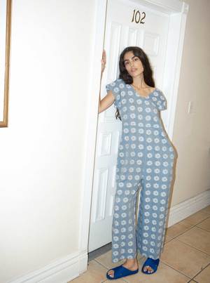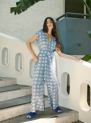 A v-neck one piece with center front buttons, pockets, and wide leg pants. Comes with a removable fabric belt. Made in our sunprint textile, a lightweight chambray blue singlecloth featuring woven flower motifs in a speckled natural. - Made in India - 100% cotton Hand wash cold or dry clean, dry flat. This garment is sewn in a Fair Trade Certified factory. Abla is 5'8" and wears our Curran Jumpsuit in the sunprint textile, size S. XXS: 16 chest, 17 waist, 21 hip, 24 inseam, 17 front rise XS: 17 chest, 17 waist, 21 hip, 24 inseam, 17 front rise S: 18 chest, 18 waist, 22 hip, 24 inseam, 18 front rise M: 19 chest, 19 waist, 23 hip, 24 inseam, 18 front rise L: 20 chest, 21 waist, 25 hip, 24 inseam, 19 front rise XL: 21 chest, 22 waist, 26 hip, 24 inseam, 19 front rise 1X: 23 chest, 23 waist, 27 hip, 24 inseam, 20 1/8 front rise 2X: 25 chest, 25 waist, 29 hip, 23 inseam, 20 5/8 front rise 3X: 27 chest, 27 waist, 31 hip, 23 inseam, 21 front rise 4X: 29 chest, 29 waist, 33 hip, 22 inseam, 21 7/8 front rise Please note: some of the measurements on this style have been updated. Please consult the measurements to select which size will fit you best. *Measurements taken flat; to calculate full circumference of chest, bicep, waist, hip or thigh, double the measurement provided.