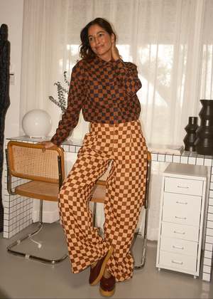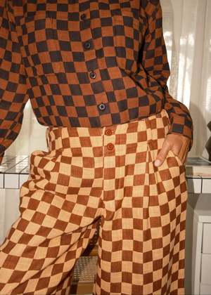 A low waist tailored, slouchy trouser with a button front and wide leg. Made in the Rhyme textile, a lofty supersoft doublecloth featuring a pale peach and cinnamon brown woven checker pattern. This feels like a knit! Made in India. 100% organic cotton. Hand wash cold or dry clean, dry flat. This textile is made with 100% GOTS (Global Organic Textile Standard) non-GMO organic cotton without the use of harmful chemicals and synthetic fertilizers. This garment is sewn in a Fair Trade Certified factory. Julia is 5'8" and wears our Brendan Pant in the Rhyme textile, size S, styled with our Alma Shirt in Reason. Measurements (taken flat; double for circumference): XXS: 14 waist, 21 hip, 10 front rise, 31 inseam XS: 15 waist, 21 hip, 10 front rise, 32 inseam S: 16 waist, 22 hip, 11 front rise, 32 inseam M: 17 3/8 waist, 23 hip, 11 front rise, 32 inseam L: 18 waist, 25 hip, 12 front rise, 32 inseam XL: 19 5/8 waist, 26 hip, 12 front rise, 32 inseam 1X: 21 waist, 27 hip, 13 front rise, 32 inseam 2X: 22 waist, 29 hip, 13 front rise, 32 inseam 3X: 24 waist, 31 hip, 14 front rise, 31 inseam 4X: 27 waist, 33 hip, 14 front rise, 31 inseam Please note: Some measurements on this style have been updated. Please consult the measurements to select which size will fit you best. Measurements taken flat; allow for natural tolerance in sewing process.