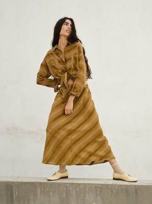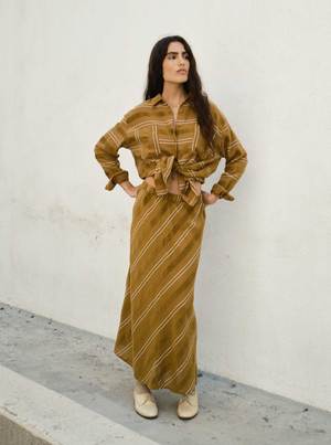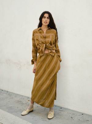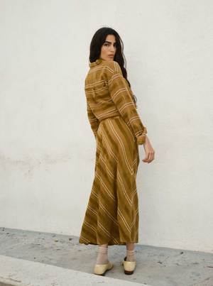 A bias slip skirt with a small elasticated waistband. Made in Ace & Jig's rattan textilea lightweight, gauzy olive brown singlecloth with luxe woven chenille-like textures and thin cream stripes. - Made in India - 100% organic cotton Machine wash cold or dry clean. Tumble dry low. This textile is made with 100% GOTS (Global Organic Textile Standard) non-GMO organic cotton without the use of harmful chemicals and synthetic fertilizers. This garment is sewn in a Fair Trade Certified factory. Abla is 5'8" and wears the Tess Skirt in the rattan textile, size S, styled with the Alma Shirt in rattan. Measurements (taken flat; +/- a tolerance natural to the sewing process): XXS: 31 long, 11 waist, 17 stretched waist, 25 hip XS: 31 long, 11 waist, 18 stretched waist, 25 hip S: 32 long, 12 waist, 19 stretched waist, 26 hip M: 32 long, 13 waist, 20 stretched waist, 27 hip L: 33 long, 14 waist, 21 stretched waist, 29 hip XL: 33 long, 15 waist, 22 stretched waist, 30 hip 1X: 34 long, 16 waist, 24 stretched waist, 31 hip 2X: 34 long, 18 waist, 26 stretched waist, 33 hip 3X: 34 long, 20 waist, 28 stretched waist, 35 hip 4X: 34 long, 23 waist, 30 stretched waist, 37 hip To calculate the full circumference of the garment on chest, bicep, waist, hip, or thigh, double the measurement provided.
