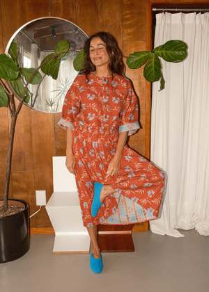 A reversible midi length skirt with an elasticated waistband. Made in Ace & Jig's Birdcage textilea luxe, supersoft, substantial fabric with woven lily motifs in peach and cyan atop red and umber triangles. Made in India. 100% organic cotton. Hand wash cold or dry clean, dry flat. This textile is made with 100% GOTS (Global Organic Textile Standard) non-GMO organic cotton without the use of harmful chemicals and synthetic fertilizers. This garment is sewn in a Fair Trade Certified factory. Julia is 5'8" and wears our reversible Rara Midi in the Birdcage textile, size S, styled with our Amara Top in Birdcage. Measurements (taken flat; allow for natural sewing tolerance): XXS: 32 long, 12 unstretched waist, 22 stretched waist XS: 33 long, 12 unstretched waist, 23 stretched waist S: 33 long, 13 unstretched waist, 24 stretched waist M: 34 long, 14 unstretched waist, 25 stretched waist L: 34 long, 15 unstretched waist, 26 stretched waist XL: 35 long, 16 unstretched waist, 27 stretched waist 1X: 35 long, 18 unstretched waist, 28 stretched waist 2X: 35 long, 19 unstretched waist, 30 stretched waist 3X: 35 long, 21 unstretched waist, 31 stretched waist 4X: 35 long, 22 unstretched waist, 33 stretched waist To calculate full circumference of the garment on chest, bicep, waist, hip, or thigh, double the measurement provided.