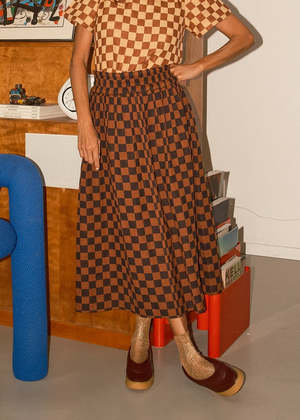 A midi length skirt with an elasticated waistband, made in Ace & Jig's Reason textilea lofty, supersoft doublecloth featuring a black and cinnamon brown woven checker pattern that feels like a knit. - Made in India - 100% organic cotton - Hand wash cold or dry clean, dry flat This textile is made with 100% GOTS (Global Organic Textile Standard) non-GMO organic cotton without the use of harmful chemicals and synthetic fertilizers. This garment is sewn in a Fair Trade Certified factory. Julia is 5'8" and wears the Rara Midi in the Reason textile, size S, styled with the Louisa Top in Rhyme. Measurements (taken flat; allow for natural sewing tolerance): XXS: 32 long, 12 unstretched waist, 22 stretched waist XS: 33 long, 12 unstretched waist, 23 stretched waist S: 33 long, 13 unstretched waist, 24 stretched waist M: 34 long, 14 unstretched waist, 25 stretched waist L: 34 long, 15 unstretched waist, 26 stretched waist XL: 35 long, 16 unstretched waist, 27 stretched waist 1X: 35 long, 18 unstretched waist, 28 stretched waist 2X: 35 long, 19 unstretched waist, 30 stretched waist 3X: 35 long, 21 unstretched waist, 31 stretched waist 4X: 35 long, 22 unstretched waist, 33 stretched waist. To calculate full circumference for chest, bicep, waist, hip, or thigh, double the measurement provided.
