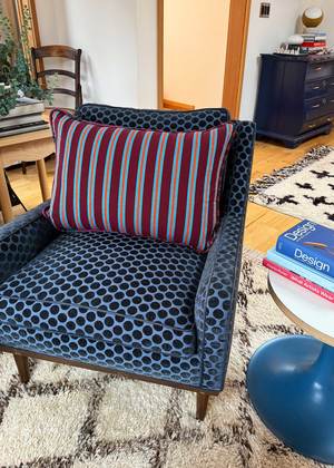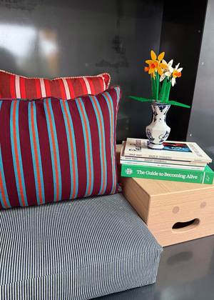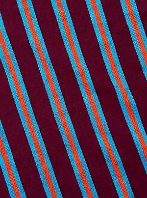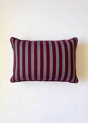 The Snuggle Piped Pillow by Ace & Jig is a supersoft rectangular pillow featuring contrasting piping in the Talent textile and a concealed zipper opening. Made from leftover textile yardage. The Rally version features a midweight burgundy singlecloth with woven stripes in cerulean and vivid orange. The piping uses Talenta luxe midweight magenta doublecloth with oversized woven multicolor square patterns inspired by crochet. Each pillow measures approximately 24" long by 16" wide, with slight variations due to the sewing process. Hand wash cold or dry clean, dry flat. Made in India in a Fair Trade Certified factory.