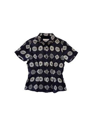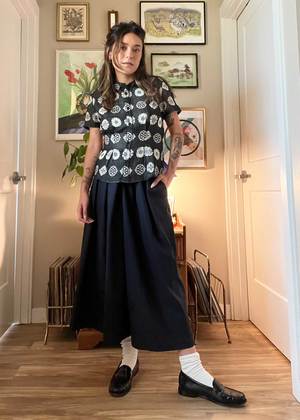 A delicate button-front collared short-sleeve shirt with subtle front and back waist tucks. Made in our Bauble textile, a lightweight supersoft black doublegauze textile with intricate woven circular motifs in butter yellow. Made in India. 100% organic cotton. Hand wash cold or dry clean, dry flat. This textile is made with 100% GOTS (Global Organic Textile Standard) non-GMO organic cotton without the use of harmful chemicals and synthetic fertilizers. This garment is sewn in a Fair Trade Certified factory. Kyra is 5'4" and wears our Allie Top in the Bauble textile, size S. XXS: 22 long, 17 chest, 6 bicep XS: 23 long, 18 chest, 6 bicep S: 23 long, 19 chest, 7 bicep M: 24 long, 20 chest, 7 bicep L: 24 long, 21 chest, 8 bicep XL: 25 long, 22 chest, 8 bicep 1X: 25 long, 24 chest, 9 bicep 2X: 26 long, 26 chest, 10 bicep 3X: 26 long, 28 chest, 10 bicep 4X: 27 long, 30 chest, 11 bicep *Measurements taken flat, +/- a tolerance natural to the sewing process. To calculate the full circumference of the garment on chest, bicep, waist, hip, or thigh, double the measurement provided.