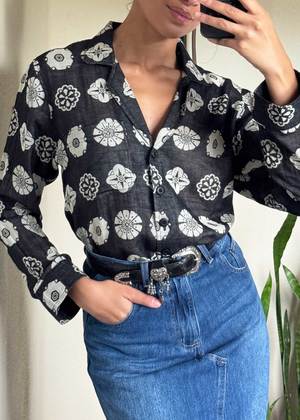 A long sleeve button-up pajama-style top with a notched collar and side slits. Made in Ace & Jig's Bauble textilea lightweight, supersoft black doublegauze with intricate woven circular motifs in butter yellow. - Made in India - 100% organic cotton Hand wash cold or dry clean, dry flat. This textile is made with 100% GOTS (Global Organic Textile Standard) non-GMO organic cotton without the use of harmful chemicals and synthetic fertilizers. This garment is sewn in a Fair Trade Certified factory. Janiah is 5'7" and wears the Diego Shirt in Bauble, size S. Size measurements (taken flat; allow for natural sewing tolerance): XXS: 26 long, 19 chest, 7 bicep XS: 27 long, 19 chest, 7 bicep S: 27 long, 20 chest, 7 bicep M: 28 long, 21 chest, 8 bicep L: 28 long, 22 chest, 8 bicep XL: 28 long, 23 chest, 9 bicep 1X: 28 long, 25 chest, 9 bicep 2X: 29 long, 27 chest, 10 bicep 3X: 29 long, 29 chest, 11 bicep 4X: 29 long, 31 chest, 11 bicep *To calculate full circumference of chest, bicep, waist, hip, or thigh, double the measurement provided.