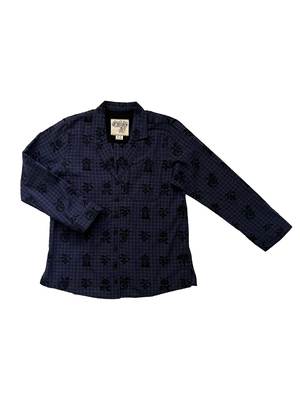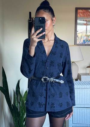 A long sleeve button-up pajama-style top with a notched collar and side slits. Made in the Trinket textile, a very lightweight textured singlecloth featuring a dark blue and dark gray check with black motifs woven throughoutreminiscent of cross-stitch embroidery. Made in India. 100% organic cotton. Hand wash cold or dry clean, dry flat. This garment is sewn in a Fair Trade Certified factory. Janiah is 5'7" and wears our Diego Shirt in the Trinket textile, size S. XXS: 26 long, 19 chest, 7 bicep XS: 27 long, 19 chest, 7 bicep S: 27 long, 20 chest, 7 bicep M: 28 long, 21 chest, 8 bicep L: 28 long, 22 chest, 8 bicep XL: 28 long, 23 chest, 9 bicep 1X: 28 long, 25 chest, 9 bicep 2X: 29 long, 27 chest, 10 bicep 3X: 29 long, 29 chest, 11 bicep 4X: 29 long, 31 chest, 11 bicep