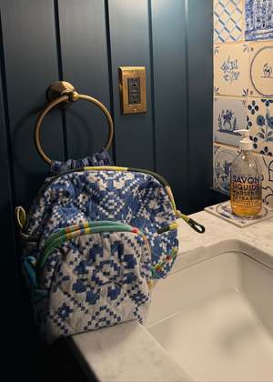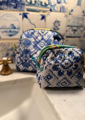A small quilted pouch featuring a zipper closure with contrast piping and a small interior pocket. Each pouch is made lovingly with leftover textile yardage from past collectsions, in keeping with Ace & Jig's longstanding commitment to reducing textile waste. Made in the Pastime textile, a luxe jacquard-woven natural singlecloth with woven ornate motifs in cobalt blue, with contrast binding in the Drama textile. - Made in India - 100% organic cotton - Each small pouch measures roughly 6 1/2" tall x 6" wide x 3" deep Care: Hand wash cold or dry clean, dry flat. This textile is made with 100% GOTS (Global Organic Textile Standard) non-GMO organic cotton without the use of harmful chemicals and synthetic fertilizers. This garment is sewn in a Fair Trade Certified factory. The quilted small pouch in Pastime features contrasting piping in the Drama textile: Drama is a luxe blue-green double-gauze featuring mini multi-colored saturated stripes throughout.