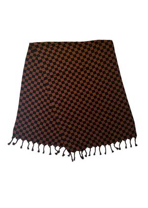 A large double-faced scarf with braided tassels. This is a larger scarf than our classic spray scarf. Made in our Reason textile, a lofty supersoft doublecloth featuring a black and cinnamon brown woven checker pattern. This feels like a knit! Made in India. 100% organic cotton. Hand wash cold or dry clean, dry flat. This textile is made with 100% GOTS (Global Organic Textile Standard) non-GMO organic cotton without the use of harmful chemicals and synthetic fertilizers. This garment is sewn in a Fair Trade Certified factory. Approximate size: 80'' long by 26'' wide. Measurements taken flat; slight variations may occur due to the sewing process.