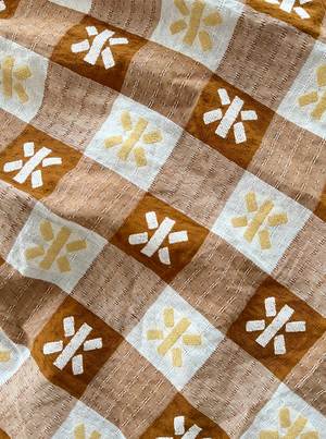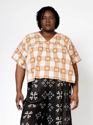 A v-neck top with a front yoke and short sleeves. Made in the Tanlines textile, a lightweight textured singlecloth with woven patterns atop an oversized brown and natural gingham. - Made in India - 100% organic cotton Hand wash cold or dry clean, dry flat. This textile is made with 100% GOTS (Global Organic Textile Standard) non-GMO organic cotton without the use of harmful chemicals and synthetic fertilizers. This garment is sewn in a Fair Trade Certified factory. Kanda is 5'11" and wears our Maura Top in the Tanlines textile, size 2X, styled with our Jo Midi in Cartwheel. XXS: 23 long, 19 wide (@ yoke seam), 27 bottom opening XS: 23 long, 19 wide (@ yoke seam), 27 bottom opening S: 24 long, 20 wide (@ yoke seam), 28 bottom opening M: 24 long, 21 wide (@ yoke seam), 29 bottom opening L: 25 long, 23 wide (@ yoke seam), 31 bottom opening XL: 25 long, 24 wide (@ yoke seam), 32 bottom opening 1X: 26 long, 25 wide (@ yoke seam), 33 bottom opening 2X: 26 long, 27 wide (@ yoke seam), 35 bottom opening 3X: 27 long, 29 wide (@ yoke seam), 37 bottom opening 4X: 27 long, 31 wide (@ yoke seam), 39 bottom opening *Measurements taken flat, +/- a tolerance natural to the sewing process. To calculate the full circumference of the garment on chest, bicep, waist, hip, or thigh, double the measurement provided.