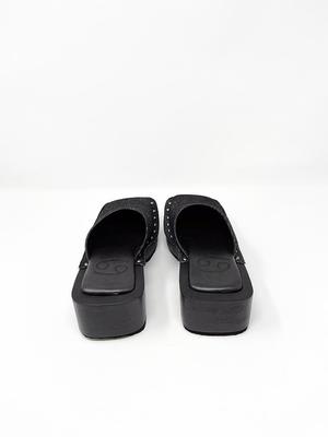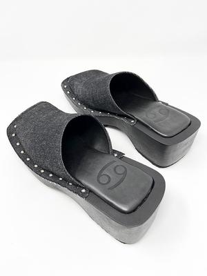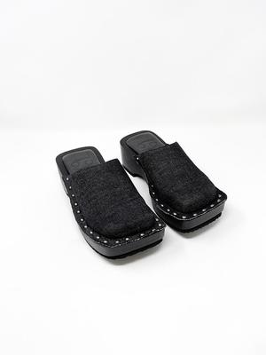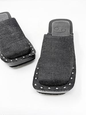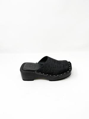 Square-toed box clog with wood platform sole, black denim upper with rivet connections. 2" block wood platform. Unisex. Half sizes, please size up.