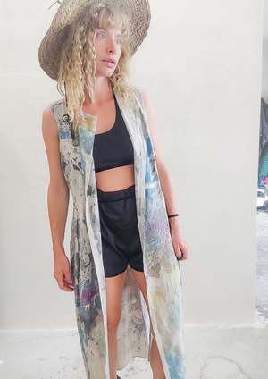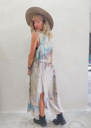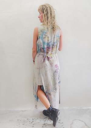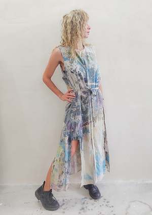 HAND PAINTED COLOR EXPERIMENT This product is a unique piece of the artistic collectsion of COLOR ADVENTURES, each garment of this collectsion is painted, dyed or altered in various techniques by BERENIK Designer Veronika Brusa in Spain. All of these experimental pieces have been washed after the artistic alternation. This particular item is a variation of this product Very versatile sportive-elegant piece that can be worn as a vest or as a dress! Button front and belt. Two high back and front slots with lining. MATERIALS 100% POLYESTER THIN DRAPING - JAPANESE - creme We love to use the highly functional acetate, triacetate or high quality polyester fabrics. We buy them from well established Japanese mills that develop the most sophisticated "new" fabric types. We appreciate the characteristics of these fabrics for their comfort and functionalities that make the garment stay in its best shape for a very long time The main characteristics are - Shrink resistant - Wrinkle resistant (perfect for traveling) - Easily washable - Elegant looking - Breathable SIZES LOOSE FIT Check our size chart for body measurements! 1 Size available XS-M