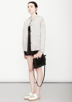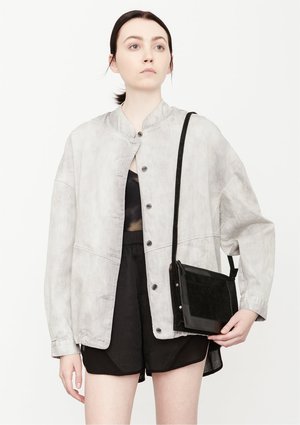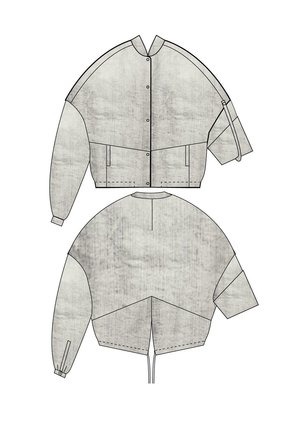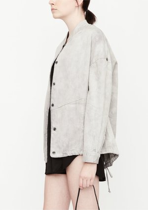 Bomber jacket with long rollup sleeves, back slot and adjustable hem with string. Front pockets, buttons MATERIALS ALL PARTS 98% COTTON/2% SPANDEX DENIM WITH GARMENT WASH/BLEACH - washed light grey NO LINING SIZES LOOSE FIT Check our size chart for body measurements! 1 Size available XS-M
