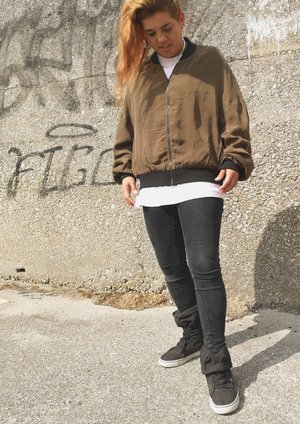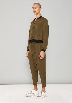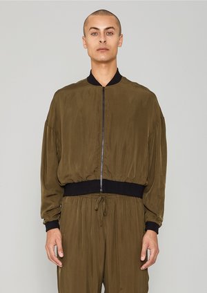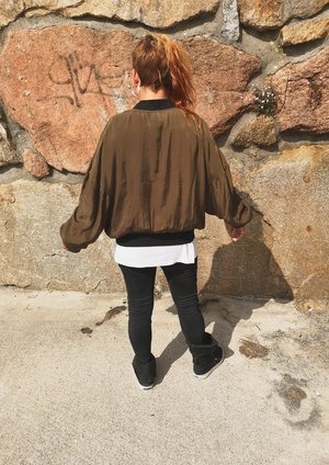 Short sportive indoor bomber jacket with long sleeves, side seam pockets and zip MATERIAL 100% CUPRO CUPRO is a natural fabric made from purified cellulose, primarily from wood pulp. The fabric can imitate the feel and texture of natural fibers such as silk, wool, cotton, and linen. That is why it is also often called artificial silk. SIZE This style has a loose fit It is available in XS-M and conveniently fits sizes XS / S / M