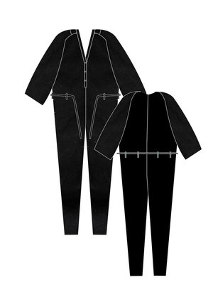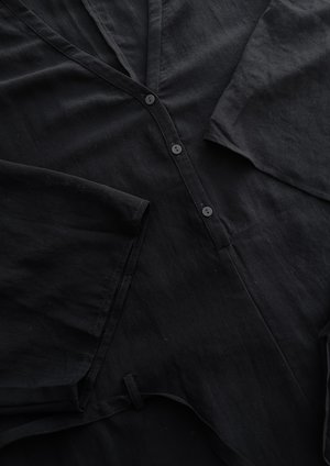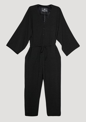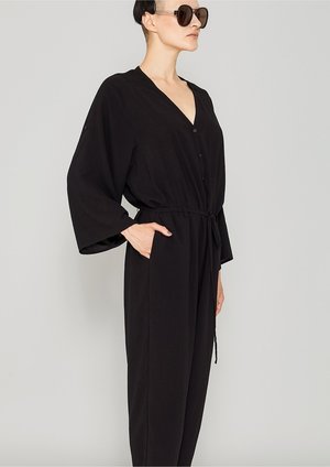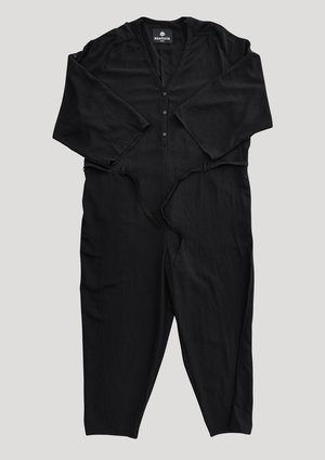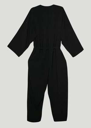Long jumpsuit with wide rollup sleeves, V-collar with buttons, side pockets and belt MATERIALS ALL PARTS 100% POLYESTER THIN DRAPING - JAPANESE - black SIZES LOOSE FIT Check our size chart for body measurements! 1 Size available XS-M (conveniently fits XXS-XL sizes)