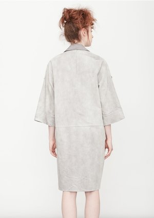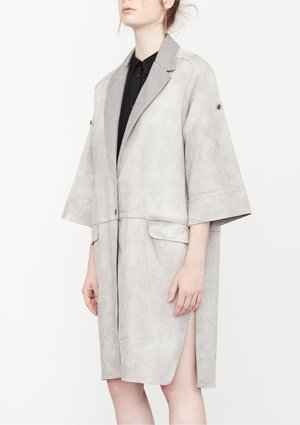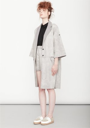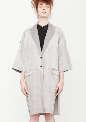 Long coat with rollup sleeves, front pockets with lid and side slots. Upper part fully lined. MATERIALS ALL PARTS 98% COTTON / 2% SPANDEX DENIM WITH GARMENT WASH / BLEACH - washed light grey NO LINING SIZES LOOSE FIT 1 Size available XS-M