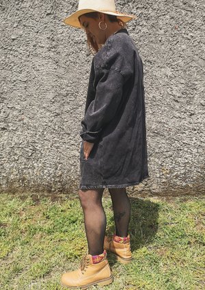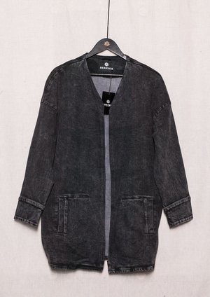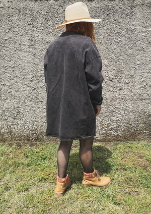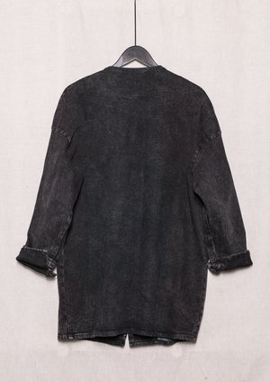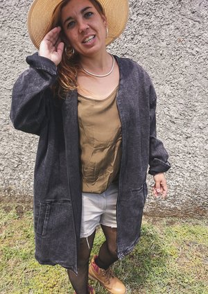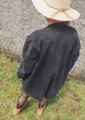 SUMMER DRESS/JACKET V-NECK ZIP - DENIM washed black - This hip Summer Jacket is a very versatile style. It combines very easily to any kind of pants, shorts, dresses or jumpsuits. - The strong denim fabric protects you from wind and sun, while it is still cooling on summer days, combined with a sweater or cardigan it is a very functional jacket also for cooler autumn or winter days - You can wear this Jacket also as a Dress, without pants or with tights or leggings - It has a front zip and pockets MATERIAL 95% COTTON / 5% ELASTAN Machine wash cold Do not tumble dry SIZE This style has a loose/oversize fit It is available in ONE SIZE and conveniently fits sizes XS / S / M / L / XL / XXL Model with hat 150cm Model beach 163 cm Model red hair 172 cm