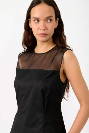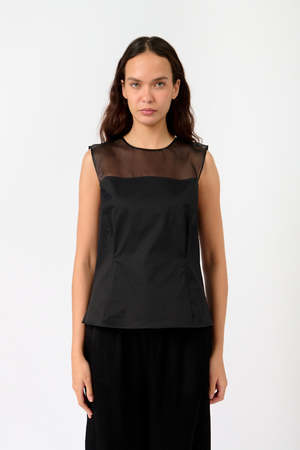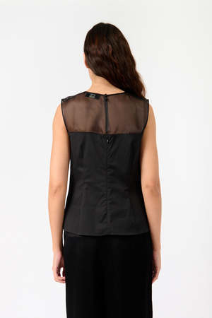 The Sleeveless Sheer Yolk Top by 7 for all Mankind is a transitional piece featuring a high neckline and a subtle peplum hem. The satin body is complemented by sheer organza panelling for an elevated, feminine look. Material - Satin - Organza Color - Black Details - Sleeveless - Satin body - Organza sheer panelling - Waist shaping darts - Slight peplum hem - Button closure at neck - Zip closure