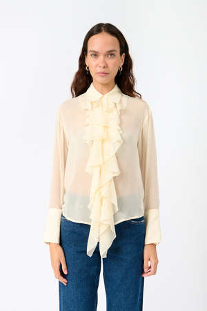 The Solidarity Star Ruffle Shirt from 7 for all Mankind features extra-long cuffs and frothy frills tracing the front for a vintage-inspired feel. Made entirely of silk, it pairs well with bold denim and stylish mules. Material - 100% Silk Size - XS, S, M, L Fit - Fits true to size Care - 100% Silk - Dry clean only - Do not tumble dry - Wash and dry separately - Turn inside out before washing Color - Off White