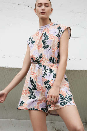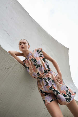 A short-sleeved, high-neck playsuit made from a 100% OEKO TEX certified viscose linen and cotton blend. It has an elastic waistband to cinch the waist for a flattering effect. It is tied with a knot at the back and then leaves an opening at the top of the back. Made in Montreal Canada. -La measures 5'10 (Bust 31" Waist 24 Hips 36) and she wears size S. Interview TRIMS NOT INCLUDED MACHINE WASH GENTLE CYCLE, COLD WATER, WITH SIMILAR COLORS HANG TO DRY IRON REVERSE WAY AT LOW TEMPERATURE Size La is 5'10 and wears size S Composition 55% viscose 30% cotton 15% linen OEKO-TEX Description A short-sleeved, high-neck playsuit. It has an elastic waist to cinch the waist for a flattering effect. It is tied with a knot at the back and then leaves an opening at the top of the back. Made in Montreal Canada.