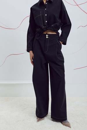 Wide-leg, high-waisted pants combining elegance and comfort with an elastic waistband at the back. The front features a zipper and two matching buttons for a polished finish. Two patch pockets at the back add practicality, while contrast stitching modernizes the classic style. Designed and made in Montreal, Canada.