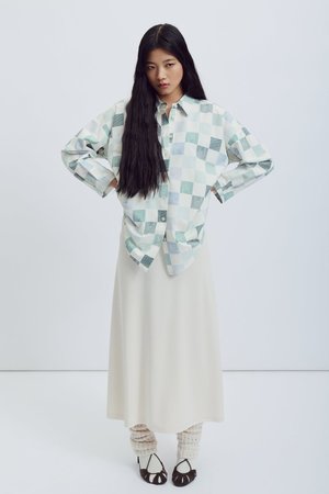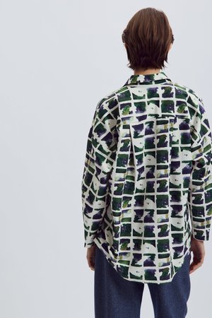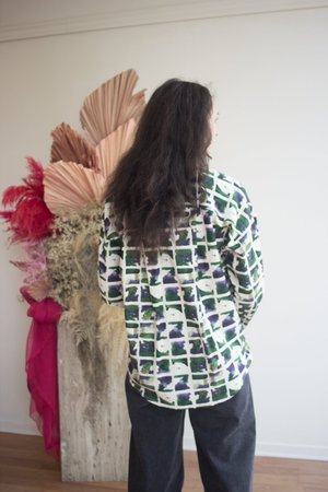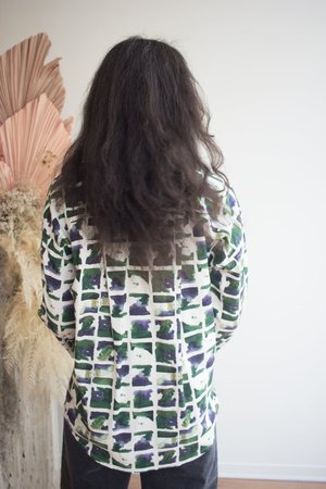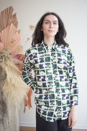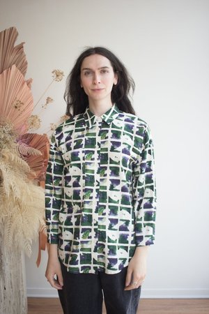 The Celeste Top by Eve Gravel is this season's version of their best selling long sleeve button-up. This long, slightly oversized shirt features a large patch pocket at the front. Ultra-comfortable and perfect for any occasion, whether casual or more dressed up. The in-house designed prints make each shirt unique and add a touch of originality to your wardrobe. This style is available for pre-order only. Please allow up to 30 business days for delivery. Bobbie Jo is wearing size S in Earth. Eve Gravel models are wearing size S. 50% Cotton, 50% Viscose (OEKO-Tex Certified). Machine washable on delicate cycle with cold water. Wash with similar colours. Dry flat and iron inside out at a low temperature. Made in Montreal, Canada.