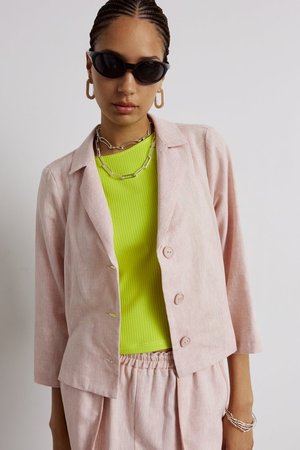 Eve Gravel's Barty Blazer is a fresh take on a classic piece. This blazer has a V-neck collar, three-quarter sleeves and three front buttons. The hem is cropped and the silhouette is slightly boxy. We love the bright spring collars of the linen cotton fabric blend! Sizing Notes: This piece is slightly relaxed without stretch. 55% Linen, 45% Cotton Fabric does not have stretch to it Wash cold, hang to dry Made in Montreal When you shop at Victoire, you are supporting independent designers and Canada's garment industry. Eve Gravel has been designing for women for more than 10 years and it's because of customers like you that this Canadian-made label continues to thrive!