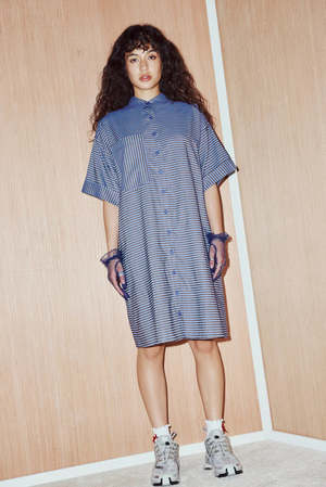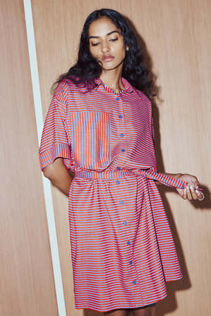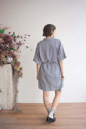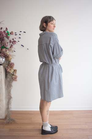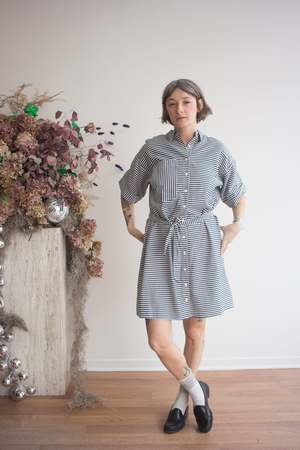 Eve Gravel's Cayuna Dress is a loose striped shirt dress with half sleeves and a wide lapel. Featuring one large patch pocket on the right chest with reverse stripes and made from an ultra-light and fluid cotton/viscose blend. Stripes for all tastes: discreet pop or basic, choose your favorite! This dress fits true to size. Models are wearing size S. 68% Viscose, 32% Cotton (OEKO-Tex Certified). Fabric does not have stretch. Wash cold, hang to dry. Made in Montreal, Quebec.