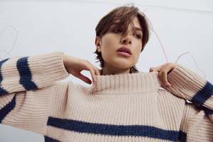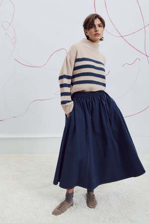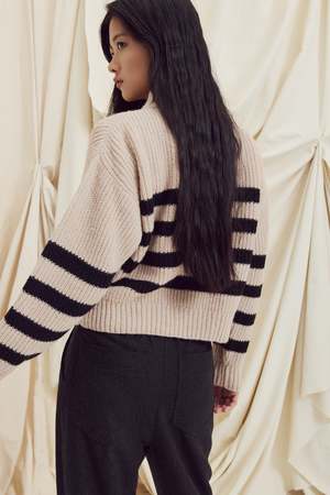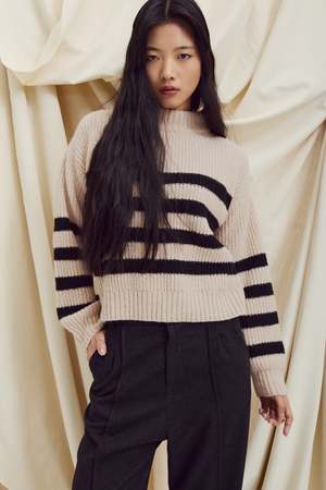 The Yalla Sweater by Eve Gravel is a limited edition striped knit from their signature collectsion. Soft, warm, and cozy, it features a slightly high collar and an oversized fit for a relaxed look. Available in two colorways: cream with blue stripes or cream with black stripes. Made in collaboration with a sustainable workshop in Peru. Chey is 59 1/2 and wears size S (cream and blue). Elena is 59 and wears size S (cream and black). Composition: 55% Baby Alpaca, 21% Fine Merino Wool, 24% Polyamide (Oeko-Tex).