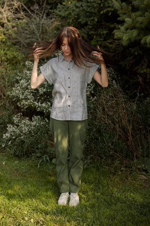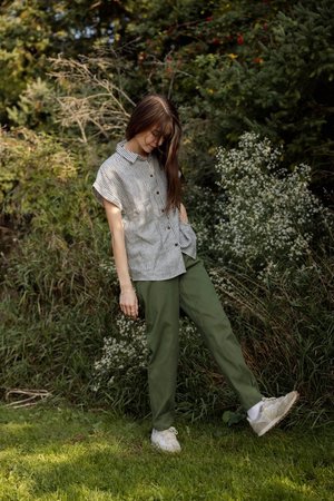 Eve Gravel's Cambridge Pants will take you back to school! These comfortable trousers are made out of stretchy textured cotton. They have a high waist, front zipper and classic 4-pocket design. They have a slouchy shape in the leg, while the pleats at the hem make them more fitted in the ankle. Pair them with the matching Brighton Blazer Jacket or Vienna Top for a full set. This item is for PRE-ORDER. It will ship in 6-8 weeks. Sizing Notes: These pants are fitted, but the fabric does have stretch and there is additional elastic in the back waist. Maddison is wearing S 97% Cotton, 3% Elastane (OEKO TEX Certified) Fabric has stretch to it Wash cold, hang to dry Made in Montreal