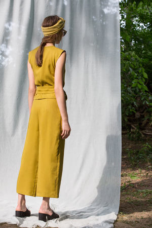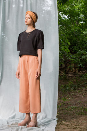 The MOROCCO pants have a loose fit and a high waist with flat pleats. Available in Black, Olive and Grapefruit, we wear it with all our tops: so easy to match! But for a monochrome and refined look, we love it with our TERRASSE top, in the same color. Made in Montreal, Canada. 100% tencel Dry clean recommended or machine wash, gentle cycle, cold water, with like colors. Hang to dry. Iron at low temperature inside out or with steam.