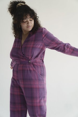 Long sleeve wrap front jumpsuit with elasticated waist at back. Available in Magenta Plaid, and Black Otelo. Fit & Sizing Cierra is wearing size XL Content & Care Magenta Plaid: 100% Cotton Made in Los Angeles, California