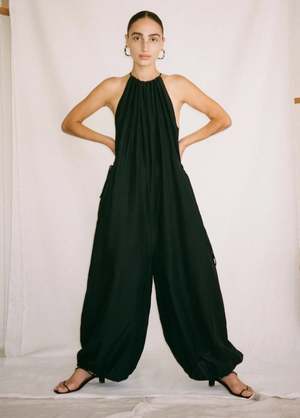 Drop-waist and drop crotch jumpsuit with adjustable drawstring ties at neck and elastic at the hem, includes side seam pockets. 41% silk 58% cotton Made in USA