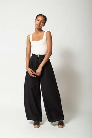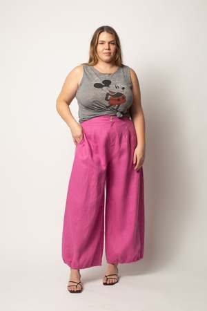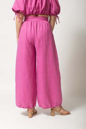 High rise wide leg linen pant featuring elasticated hems - Made in Los Angeles - 100% Linen Size fit Fits true to size, Tasha is wearing an 8, Maeleisa is wearing a 2 and Chloe is wearing a size 14.