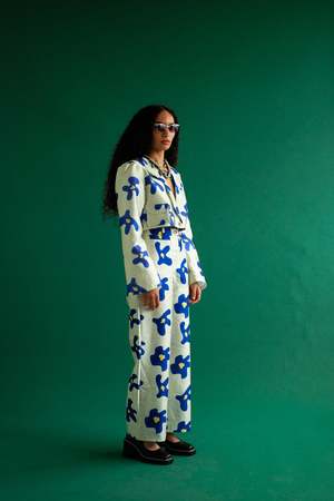 In-house floral printed shantung high waist suiting pant. Pair with our cropped Coco Jacket to make it a complete set. Fit & Sizing Ren and Franki are wearing size Small (26.5" Waist, 32" Hip) This style fits true to size Content & Care Shell: 100% Polyester Lining: 100% Organic Cotton Dry Clean Only, Do Not Iron More Information This product is only eligible for exchange or store credit. International orders are responsible for return shipping. Made ethically in Los Angeles, California
