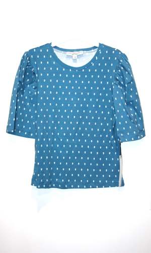 This Peahen top is lightly damaged due to an allover fabric flaw in the print: a very faint stripe that runs across the body in various places. It is subtle but visible upon close inspection. Peahen is a crew-neck knit top with an elbow-length full sleeve that is gathered at the shoulder. The fabric is a soft cotton jersey composed of 95% cotton and 5% spandex. Peahen has a ton of stretch and fits true to the brand's size chart. The length of the body ranges from 21.5" (XS) to 23.5" (3X), and the sleeve length, measured from the top of the shoulder to the hem, measures 13" (XS) to 14.5" (3X). Finished measurements of the chest circumference in inches are as follows: XS - 32 S - 34 M - 36 L - 38 XL - 41 2X - 45 3X - 48 Peahen can be hand or machine washed on a cold, delicate cycle and laid flat to dry. Everything at Birds of North America is vegan and has been made ethically in Canada since 2007, with a strong focus on sustainability and creating high-quality garments that last a long time.