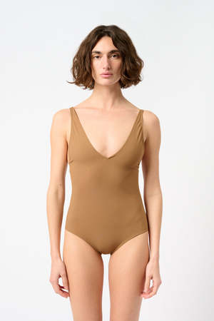 The Deep Neck Swimsuit by Totme is a one-piece style featuring a deep V-neckline, low back, and pull-on styling. It is unpadded and designed with fully adjustable shoulder straps and medium brief coverage. Composition: 73% polyamide (recycled) and 27% elastane. Care: Machine wash. Color: Nougat. Made in Portugal.