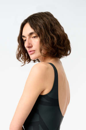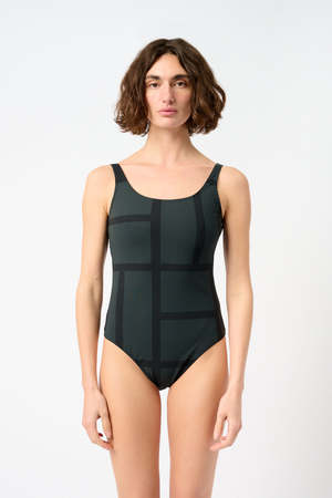 The Positano Monogram Swimsuit from Totme features the brands graphic monogram, blown up to abstract dimensions and embroidered on the front. It is woven with plenty of stretch for comfort and shape retention. Designed with a rounded neckline and gently scooped back, the swimsuit is framed by wide straps and offers medium brief coverage. Material 80% Polyamide, 20% Elastane (stretch recycled polyamide blend) Fit Fits true to size; take your normal size. Medium brief coverage. Details & Care Charcoal and black stretch recycled polyamide. Pull-on style. 80% recycled polyamide, 20% elastane. Machine wash. Sizes Available in sizes SM.