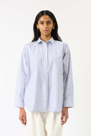 The Totme Striped Half-Placket Shirt is the perfect blend of style and comfort. Made from 100% cotton poplin, this shirt features a subtle blue and white striped design and a half-placket for a unique touch. Its lightweight material and breathable fabric make it an ideal choice for any occasion. Size & Fit - Model is wearing size 34. Details & Care - 100% organic cotton - Classic collar - Front button fastening - Long sleeves - Button-fastening cuffs - Striped - Machine wash - Color: Blue and white Totme's Striped Half-Placket Shirt in 100% cotton poplin blends chic style and breathable comfort with a sleek, versatile design.