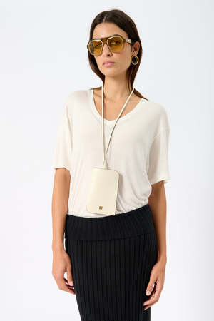 Totme white pocket bag in traditional smooth leather with a twisted necklace strap, finished in light beige leather and lined with a flushed gold-tone monogram plaque. Measures approximately 15cm / 5.9" H x 10cm / 3.9" W x 0.5cm / 0.2" D. Strap drop length 44cm / 17.3". One size. Leather. Totme logo2. Colour: Milk.