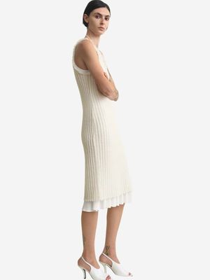 The Mohair Knit Tank Dress by Totme is knitted from fuzzy mohair in an open weave with raw edges in an off-white tone. The sleeveless silhouette features a scoop neckline and is layered over a slinky viscose tank dress with a kick flare hem that adds subtle movement. Color: Off-white Material: 56% RMS mohair, 30% recycled polyamide, 14% RWS wool; lining: 100% viscose Care: Cool hand wash Designer ID: 262-WRD0341-YA0161 Type: Dress