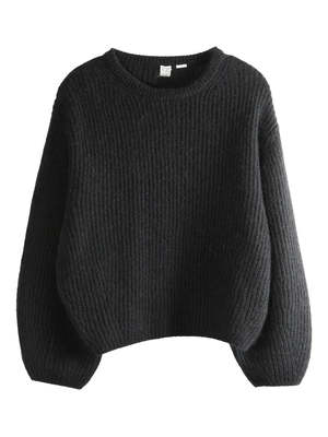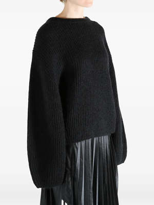 TOTEME'S Mohair Blend Rib Knit features voluminous long sleeves and a crew neck in a rib knit. Designer ID: 261-WRT0652-YA0161-001 Color: Black Composition: 56% Mohair, 30% Recycled Polyamide, 14% Wool.