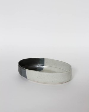 We love these oval bowls for all our hearty shared grain and pasta salads. The lightweight bowls make for easy passing around the table and take up little space with their oval shape. Made from durable stoneware, hand-built by Len Carella exclusively for Kettle & Brine. Each piece is constructed and slab built individually celebrating the natural variances of clay and form. The bowls are fired to cone 10, making them highly durable and suitable for all food uses. SPECIFICATIONS 12" x 9" x 2.75" MATERIAL Black and white gradient satin glaze on raw vitreous brown clay body CARE & USE Dishwasher, microwave and oven safe. To heat in the oven, place the piece in a cool oven and gradually bring it to temperature to avoid cracking. ORIGIN San Francisco, CA