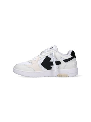Men > Shoes > Sneakers Off-White Out Of Office sneakers in white leather with round toe, laces, iconic tag detail with engraved logo2, logo2 patch on tongue, contrast leather arrow logo2 patch on the side, contrasting leather back tab, contrast trim, white logo2 print detail, and rubber sole. Composition: 53% Calf Leather, 47% Recycled Polyester.
