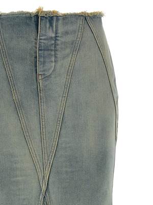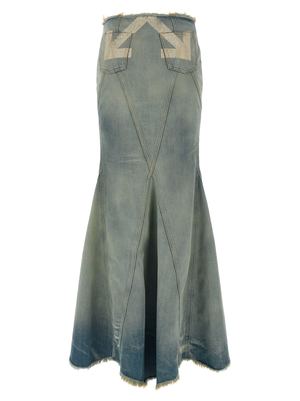 Long 'Jane' skirt in stonewashed cotton denim with used effect, fringes at the waist and on the hem, mermaid silhouette, front button closure, 'Half Arrow' print with vintage effect on the back, asymmetrical hem, unlined. Composition: 100% cotton.