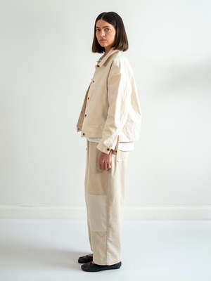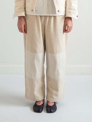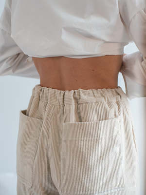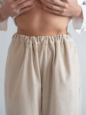 The Ivory Velvet Corduroy Pants reinterpret relaxed dressing in a lighter tone. Made from plush 100% cotton velvet corduroy, they offer a soft drape and rich texture that feels indulgent yet grounded. The pull-on elastic waistband delivers ease, while tonal cotton knee patches provide subtle contrast and durability without disrupting the monochrome palette. The leg is cut relaxed and slightly tapered, ideal for pairing with the coordinating PJ Jacket or worn solo for a sculptural, neutral base. These are pants that feel like loungewear but look like something more textural, tactile, and styled for everyday balance. Details: - 100% cotton velvet corduroy soft, breathable, and wide-waled - Elastic pull-on waist for effortless comfort - Tonal cotton knee patches add texture and light utility - Relaxed tapered leg with a fluid silhouette - Pairs with the Ivory PJ Jacket, or mixes easily with knits and shirting