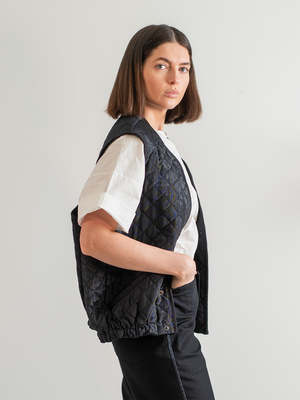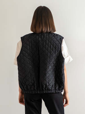* PRE-ORDER ship date after October 13th The Black Cotton Moir Quilted Vest is a refined layering piece crafted from 100% cotton moir. The fabrics subtle wave-like texture adds dimension and depth to the deep black finish, offering a modern take on utilitarian outerwear. Diamond quilting provides lightweight warmth, while open armholes and a relaxed fit make it easy to layer over button-downs or under coats. The elasticated hem gives shape without clinging, creating a clean silhouette whether worn open or snapped shut. Matte black finish with tonal binding for a minimal look.