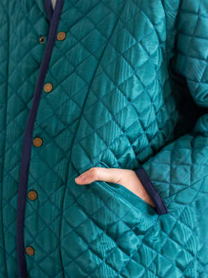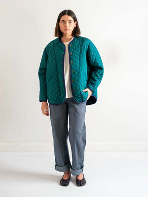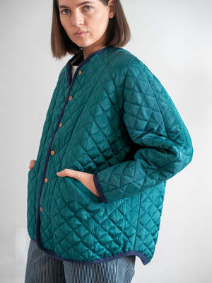 The Blue Spruce Quilt Jacket combines classic quilted construction with the depth of moir texturethis time in a saturated jewel-tone blue. Crafted from a moir cotton-acetate blend, the fabric features a soft, wave-like pattern that subtly shimmers as it catches the light, giving the surface quiet movement. This version is elevated by its rich tone and contrast navy binding, paired with a boxy, layer-friendly fit and diamond quilting for warmth without weight. Snap closures keep the front clean and versatile, making it easy to dress up or down. Details: - Moir cotton/acetate blend with tonal shine - Diamond quilted texture for warmth and dimension - Blue Spruce exterior with contrast navy binding - Snap front closure - Boxy, relaxed fit for easy layering