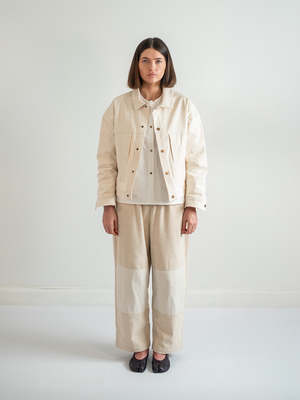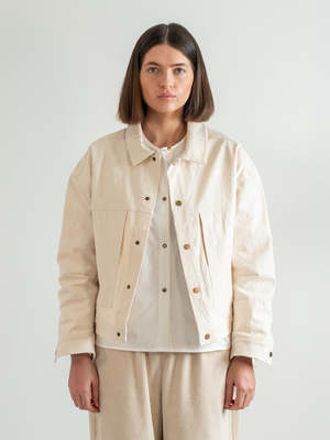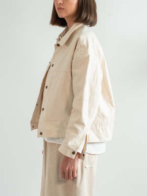 The Ivory Varsity Jacket brings timeless workwear structure into a modern everyday layer. Cut from sturdy washed cotton canvas, it combines durability with a broken-in softness that wears beautifully over time. The oversized, boxy silhouette makes layering effortless, while metal snap closures lend a utilitarian edge. Generous front patch pockets and subtle seam detailing add both function and refinement. Light in color yet strong in character, this jacket is a versatile staple that shifts seamlessly between casual and polished looks. Details: - Made from washed cotton canvas - Inspired by vintage workwear staples - Oversized, boxy fit - Metal snap closures down the front - Large front patch pockets - Midweight feel, ideal for layering - 100% Cotton, machine wash like colors, tumble dry low