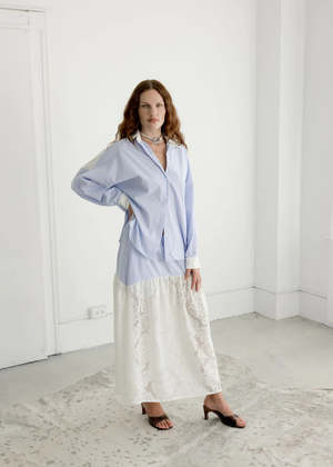 For frolicking and foraging: the Field skirt. Lanai Lace: 40% Cotton, 40% Nylon, 20% Rayon. Features two side seam pockets and an elastic waistband. Subtle curved yoke seam with gathers. Hand wash cold and hang to dry. Made in Canada.