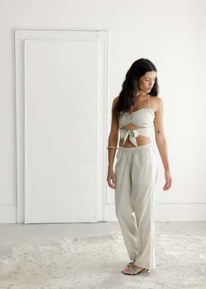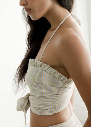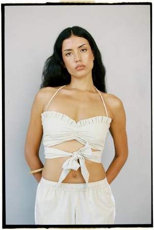 The Cha Cha Bra by A Bronze Age is made from 100% cotton. Care: Machine wash cold, hang to dry. Made in Canada. Founded in 2016 by Rene Power, A Bronze Age is a contemporary brand committed to local manufacturing, with all timeless, multi-season pieces designed and produced within 20 km (12 miles) of their Vancouver-based studio. Operating primarily made-to-order, the brand reimagines everyday style with thoughtfully sourced fabrics sewn by hand by local sewers and seamstresses. With Power's aunts and cousins working alongside her, the brand is propelled by three generations of women, a value evident in the thoughtful construction of each item.